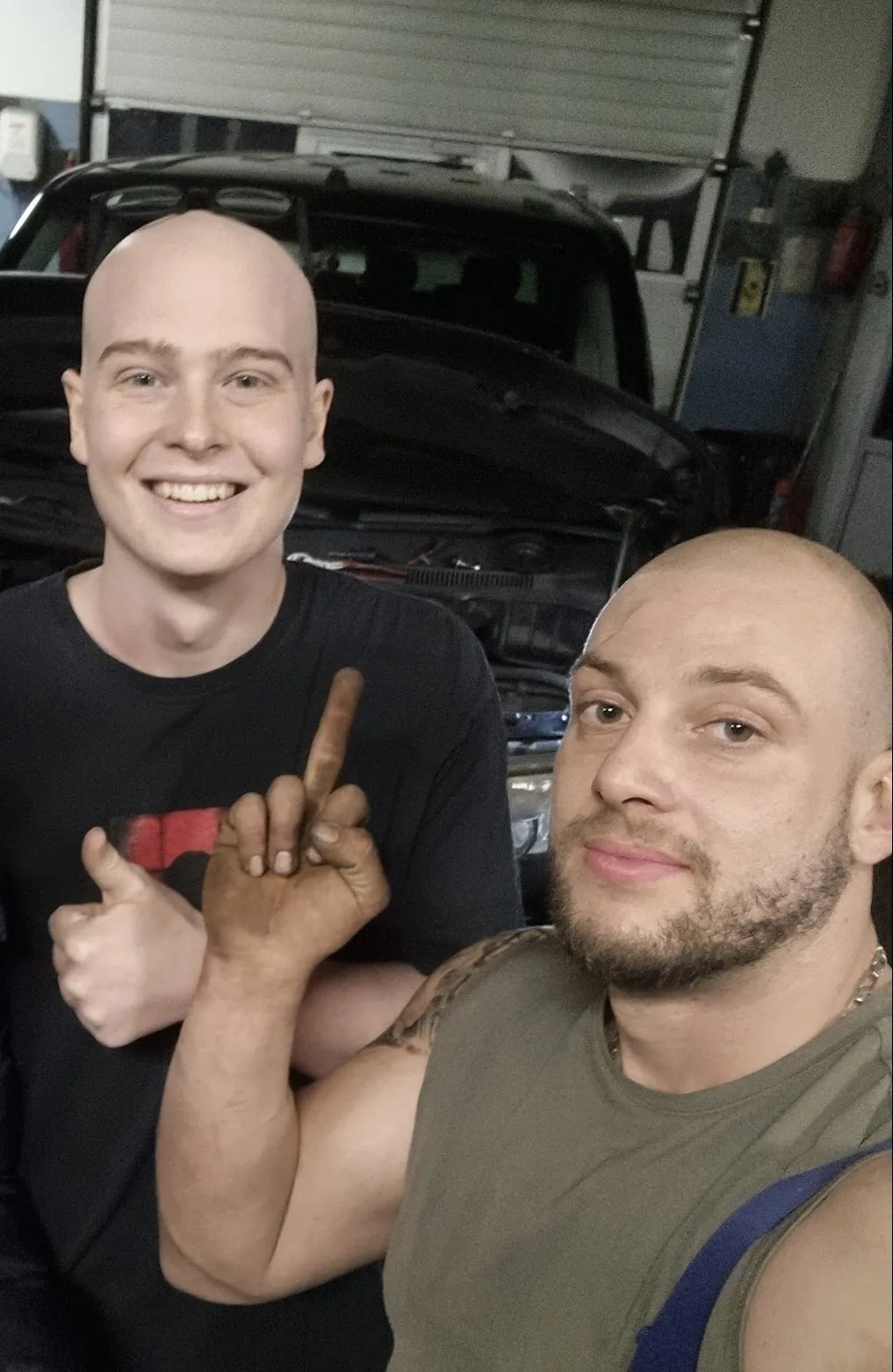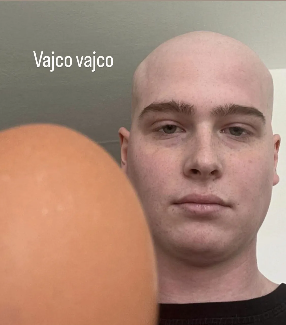 Luky měl krásné, dlouhé a husté vlasy. Když mu, díky jeho zákeřné nemoci, vlasy vypadaly, začal říkat svému novému "účesu" VAJCO.
