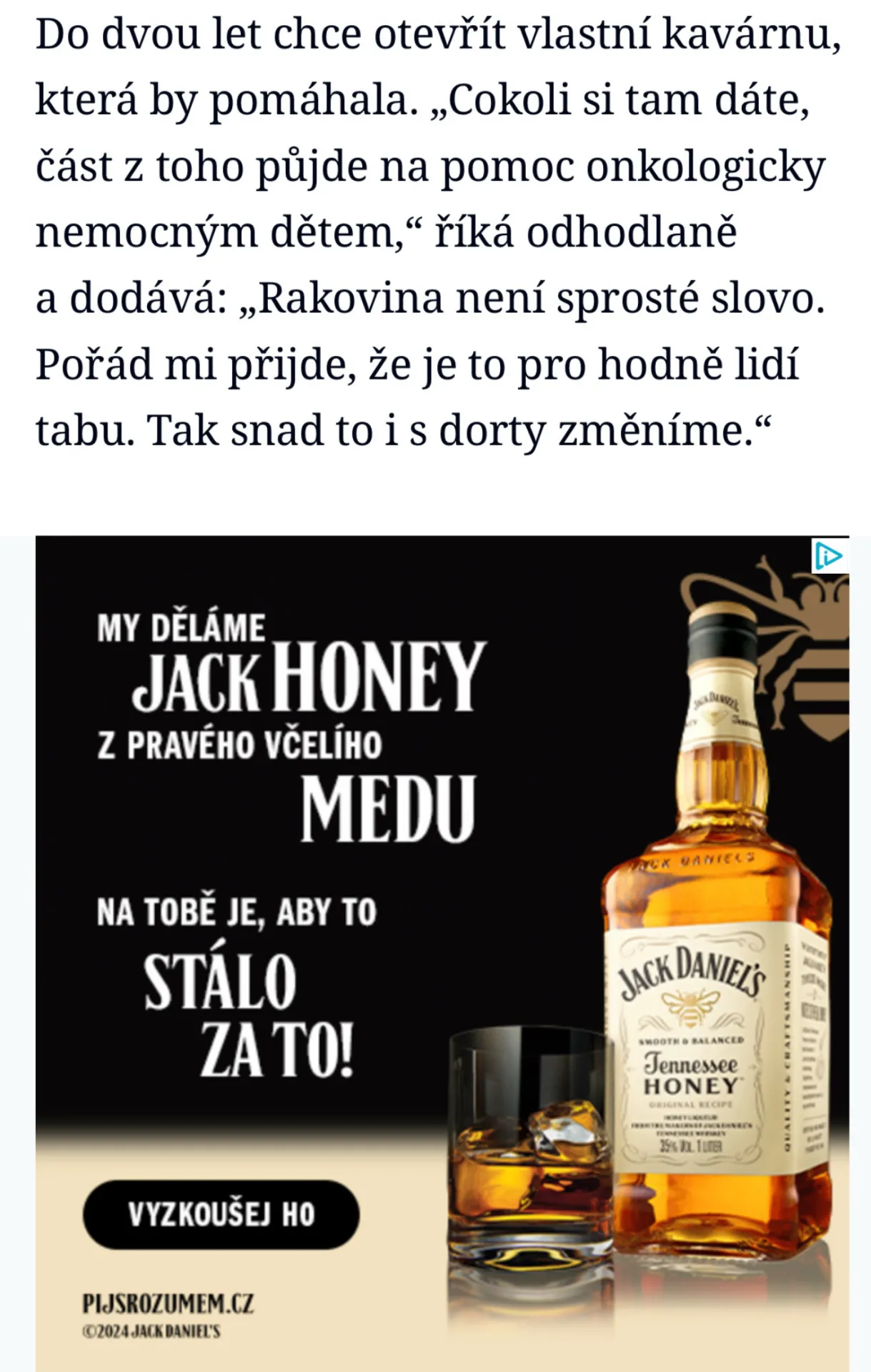 Četl jsem si na internetu článek (časopis Forbes) o lidech, kteří pomáhají onkologicky nemocným dětem a objevila se tam reklama na Lukyho oblíbené pití: Jack Daniel¨s whisky Honey. Je to velmi lahodné pití, které si dáváme jako přípitek na Lukyho počest. Doporučuji. Člověk by u článku o dětské rakovině čekal spíše reklamu od farmaceutické firmy na nějaký lék …