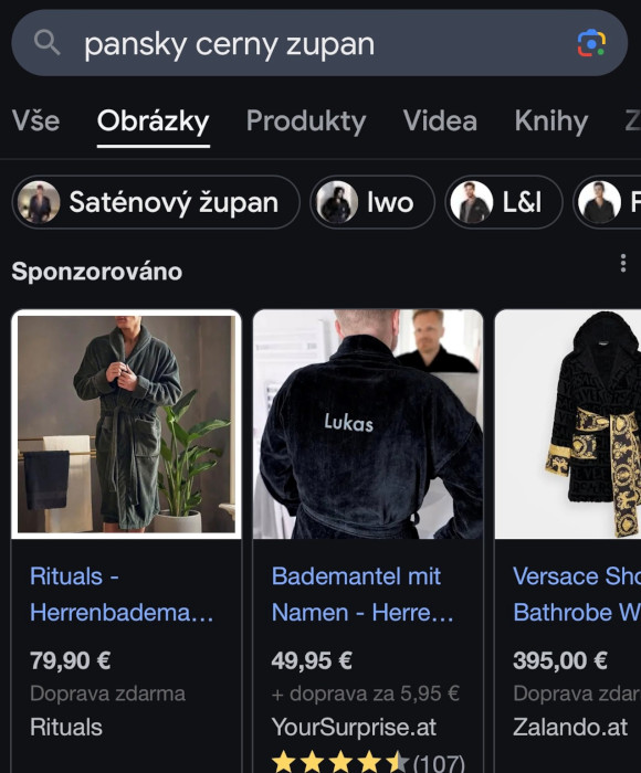 Tom, chtěl k narozeninám nový župan. Dal jsem do vyhledávače „černý pánský župan“ a objevila se mně nabídka černých županů se jménem LUKAS …